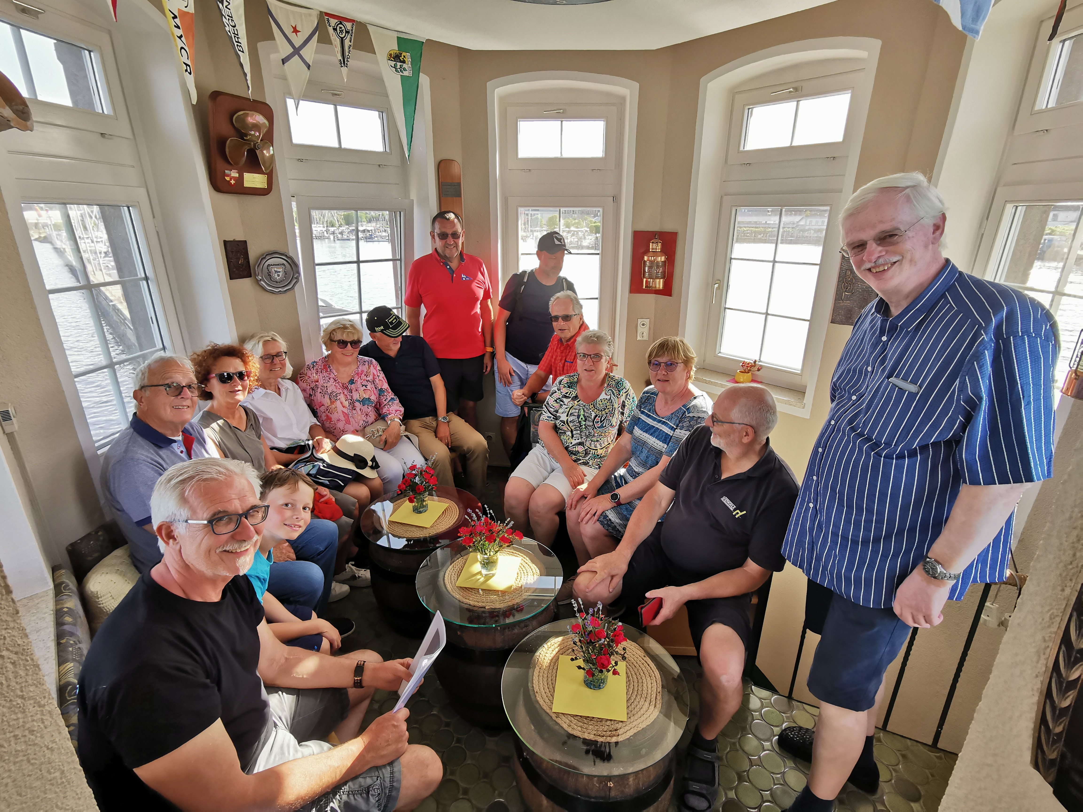 Als „Schmankerl“ hatte Harald noch eine Besichtigung des im Jahre 1842 aus Sandstein erbauten Leuchtturms auf der Südmole der Hafeneinfahrt organisiert. Die Aussicht von dem 18 m hohen Turm auf das Getümmel im Hafen, auf die Zinnen und Gassen der Stadt, die imposante „Imperia“ und den glitzernden See, ist schon etwas Besonderes! Die enge Wendeltreppe im Innern, die kreisrunden Räumchen, deren Ausstattung mit Fotos und Insignien aus alten Zeiten, bieten einen kleinen Einblick in die Geschichte dieses wehrhaften Bauwerks. Clubwimpel und kleine Holztafeln mit winzigen Stickern vieler Segelclubs rund um den See, zeugen von der Tradition des Segelsports. Darunter auch - wen wundert`s - die Farben unseres SMCÜ !